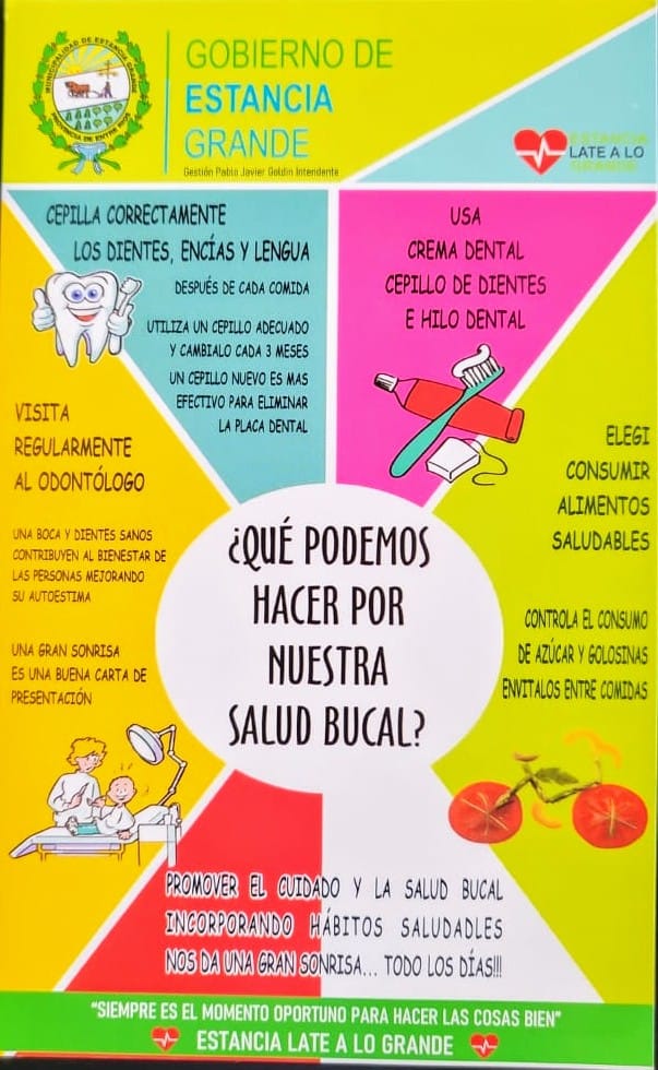 Desde el Municipio de Estancia se promueve un área de la salud que es de suma relevancia y de lo cual hay que cuidar y tener siempre presente en la prevención, tratandose de «LA SALUD BUCAL». Este estado de salud en la boca incluye los dientes, encías, lengua y otros tejidos.